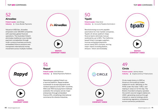 Revolutionising accounts payable automation for mid-market companies, Tipalti’ s AI-driven platform helps finance teams eliminate manual workload by up to 80 %. The Californiabased fintech manages suppliers, invoices and global payments across nearly 200 countries, serving major clients including Roblox, Amazon, Twitch and GoDaddy.