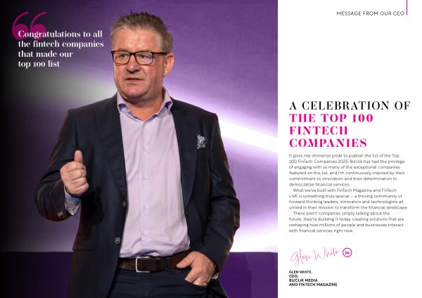 It gives me immense pride to publish the list of the Top 100 FinTech Companies 2025. Bizclik has had the privilege of engaging with so many of the exceptional companies featured on this list, and I ' m continuously inspired by their commitment to innovation and their determination to democratise financial services.