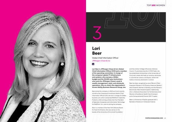 Lori Beer is JPMorgan Chase & Co ' s Global Chief Information Officer ( CIO ) and a member of the operating committee . In charge of the company ' s global IT infrastructure and systems , she oversees a $ 14bn budget and the 55,000-plus technicians who work for JPMorgan Chase ' s asset & wealth management , retail , and wholesale operations . She co-chairs the organisation ' s Access Ability Business Resource Group , too .
